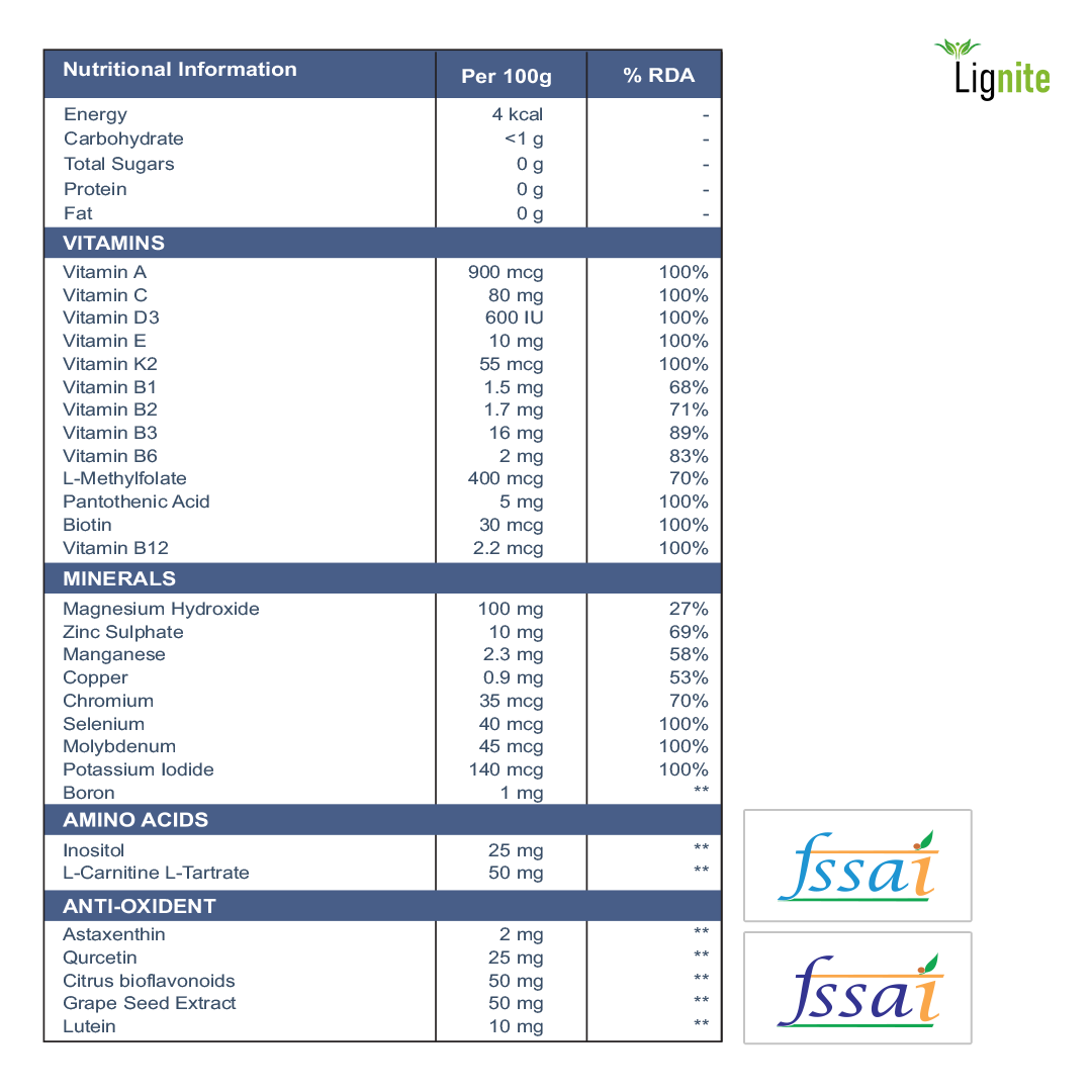 Lignite Multivitamin & Multimineral is formulated with nutrients in balanced, daily-use amounts — not high or aggressive doses.
