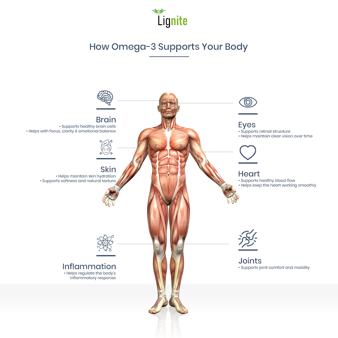 Lignite Omega-3 Capsules provide essential fatty acids that support heart health, brain function, and overall wellness.